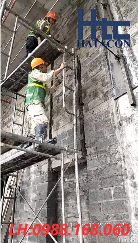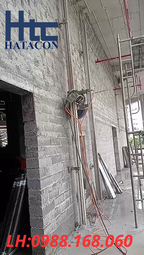 Hình ảnh dưới đây ghi lại quá trình **đội ngũ kỹ thuật Hatacon trực tiếp cắt mở đường PCCC trên tường gạch bê tông** bằng máy cắt cao tần chuyên dụng – thể hiện rõ quy trình làm việc an toàn, chuyên nghiệp và hiệu quả.